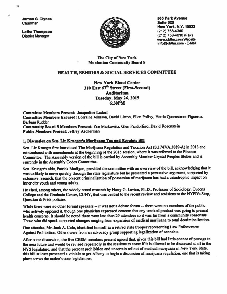 Last night Manhattan Community Board Number 8 overwhelmingly voted to adopt 2015-06 Manhattan Comm Bd 8 Resolution re MRTA. In essence it calls upon the state legislators who represent Community Board 8 in the Senate and Assembly to take action to cause a “serious discussion” of the Marihuana Regulation and Taxation Act (“MRTA”), i.e. the proposed full legalization statute introduced by Senator Liz Kruger and Assembly Member Crystal People-Stokes.